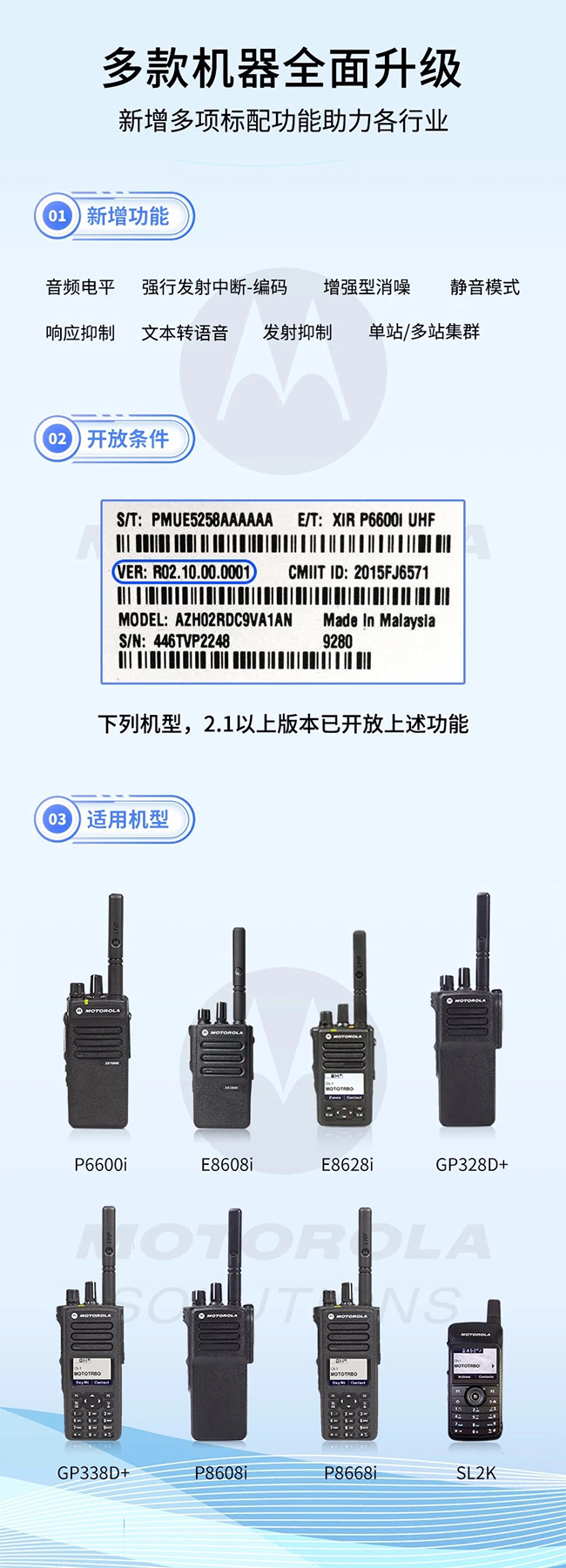 從2019年第四季度開始,我司經(jīng)銷的多款摩托羅拉對(duì)講機(jī)新版機(jī)器在出廠時(shí),有些功能已經(jīng)免費(fèi)開通供客戶使用了,其中包括:音頻電平、強(qiáng)行發(fā)射中斷-編碼、增強(qiáng)型消噪、靜音模式、文本轉(zhuǎn)語(yǔ)音、發(fā)射抑制、響應(yīng)抑制和單站/多站集群。