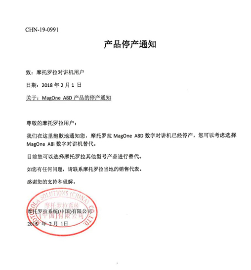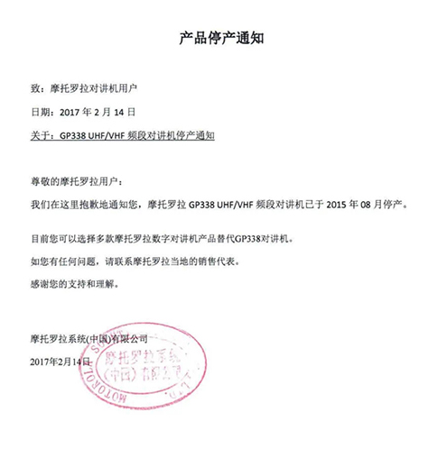 摩托羅拉系統(tǒng)根據(jù)國(guó)家相關(guān)要求,已于2015年逐步停止了模擬機(jī)全球工廠的生產(chǎn),同時(shí)按照國(guó)家有關(guān)規(guī)定,相關(guān)機(jī)型的《無(wú)線電發(fā)射設(shè)備型號(hào)核準(zhǔn)證》及《防爆電氣設(shè)備防爆合格證》均已不再辦理延期手續(xù)。
