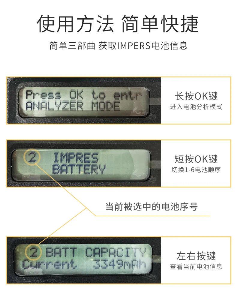 2代IMPRES智能六聯(lián)充,突破1代顯示屏只能查看第1個充電插槽中IMPRES電池信息,增設(shè)切換按鍵,無需反復(fù)插拔電池,便可獲取6個充電插槽中任意1個IMPRES電池的相關(guān)信息。